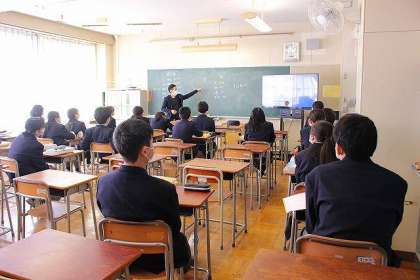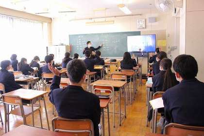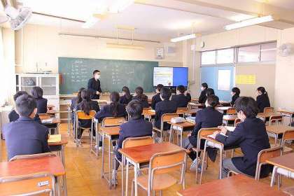 教室からにぎやかな声が響いています。現在形の英文、否定文は? どうやら英文の内容が担当の先生に関わるもののようです。微笑ましく感じました。