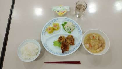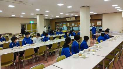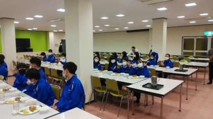 一日目の夕食は、とりのから揚げ。ご飯と豚汁は、おかわりできます。たくさん召し上がれ!
