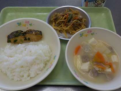今日の献立:ごはん、白身魚の三味焼き、変わりきんぴら、呉汁