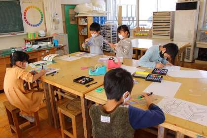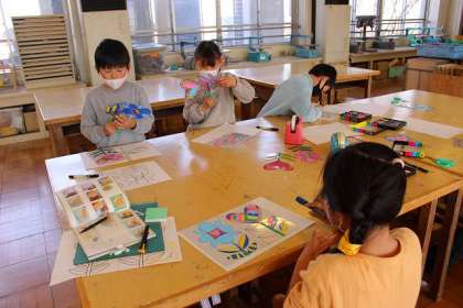 「うごくお花」アクリル板に絵を写して色を塗ります。