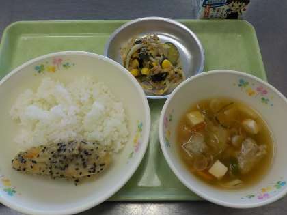 今日の献立【3.11復興応援献立】:ご飯、笹かまぼこの南部揚げ、女川汁、三陸わかめとツナの和え物