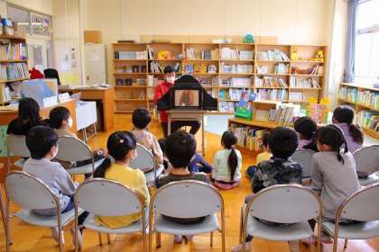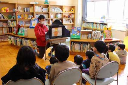 担任の先生による本の読み聞かせです。「ぐうたらな王さまとまほうのドングリ」を読んでいるところです。