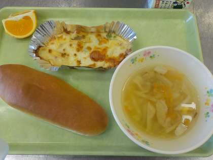 今日の献立:ミルクパン、マカロニグラタン、キャベツスープ、くだもの