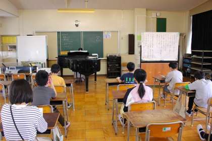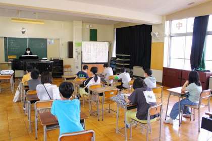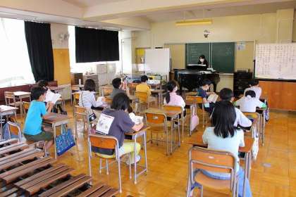 校歌をうたっています。「誰もがそれぞれ もっている 美しい種を 育てよう 未来にすばらしい花を 咲かせるために 咲かせるために」