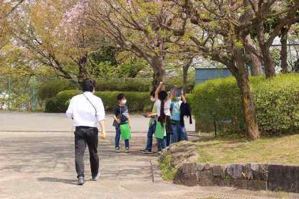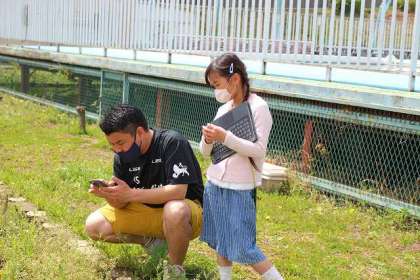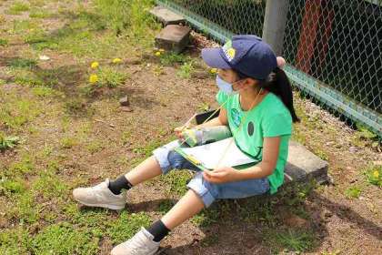 校庭に出て「かんさつカード」に書いています。5年生も校庭で学習しています。