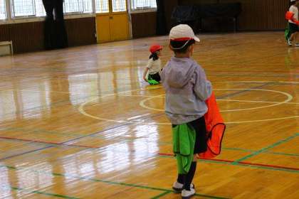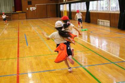 「しっぽとりゲーム」で体育館を走り回っています。