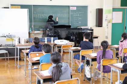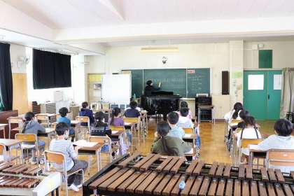 「音楽で心の輪を広げよう」『花束をあなたに』のリズムを確かめています。