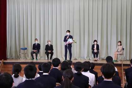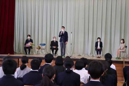 鈴木副校長先生のご挨拶です。続いて、岡先生に生徒からの言葉とお花です。岡先生のご挨拶です。