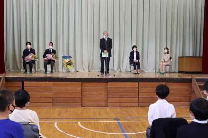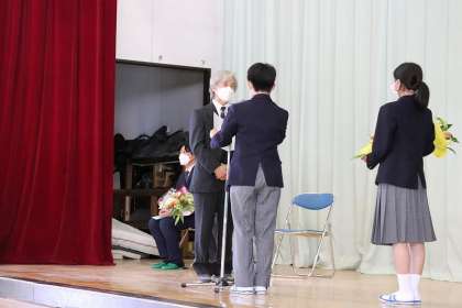 井上先生に生徒からの言葉とお花を贈りました。井上先生のご挨拶です。岩崎先生(当時)に児童からの言葉とお花を贈りました。