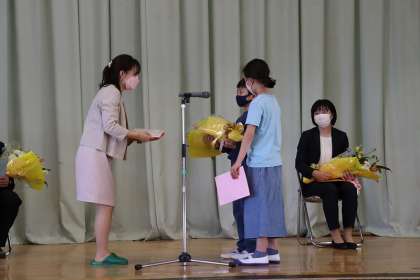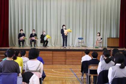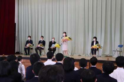 岩崎先生のご挨拶です。続いて田原先生に児童からの言葉とお花を贈りました。田原先生のご挨拶です。