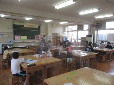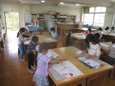 先日写生会で描いた消防車、その消防車が走る街並みの絵を描いています。