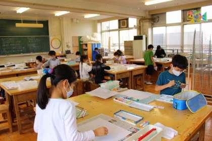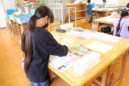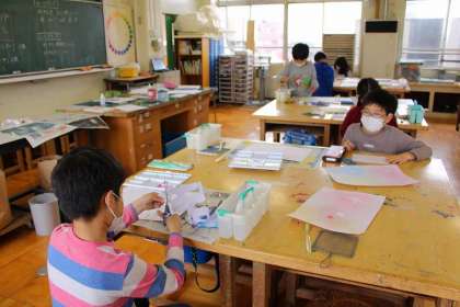 「絵の具でゆめもよう」スパッタリング・マーブリングという技法をつかって、画用紙に模様を描いています。