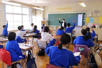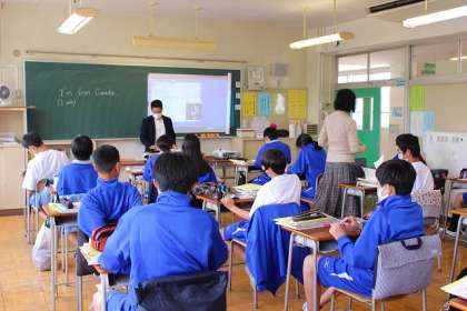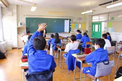 前時の復習をしています。be動詞は? たくさん手が挙がっています。