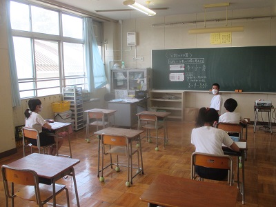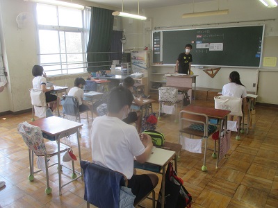 分数×分数の学習、分母同士、分子同士をかければ答えが出ることを学んでいます。