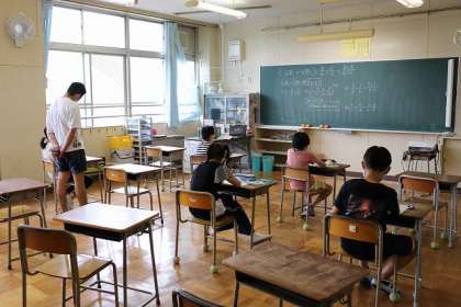 2つのクラスに分かれて「分数のかけ算」の計算練習をしています。