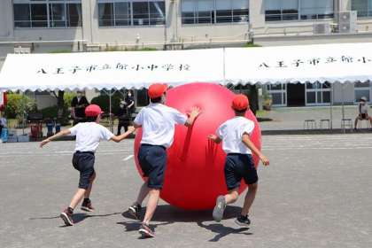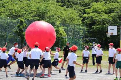 全校競技「大玉送り」です。赤組の様子です。