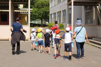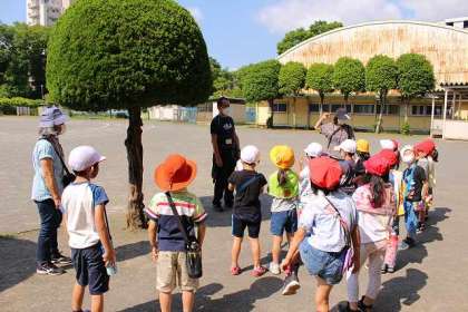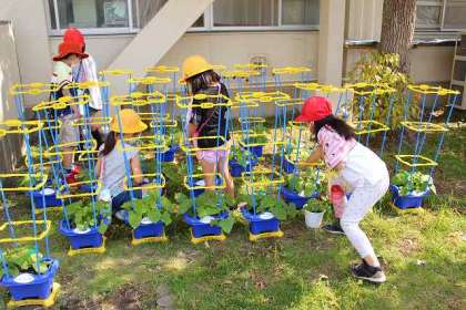 「公園へいこう」公園に出かける前にアサガオに水をあげます。地域ボランティアの方が一緒に行ってくださいます。「よろしくお願いします」
