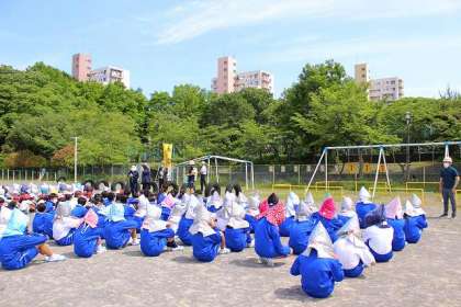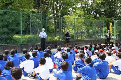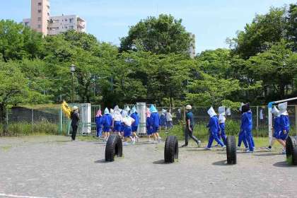 地震発生の想定で、校庭に避難しました。その後、土砂災害警報により2次避難することになりました。『白グラ』へ移動しました。