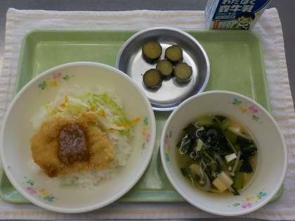 今日の献立:味噌チキンカツ丼、ボイルキャベツ、スタミナきゅうり、青菜と豆腐のすまし汁