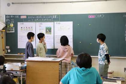暖かい地方では、産業について、どんな工夫をしているのかな? グループの考えを発表しています。