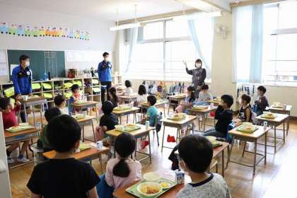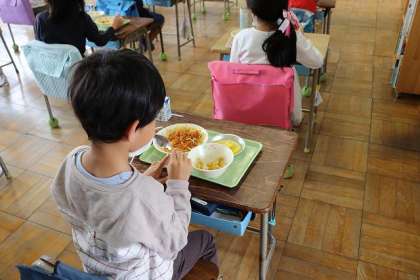 小学部1〜3年生が、拓殖大学の学生さんと一緒に給食を食べました。