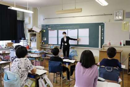 教育実習生による研究授業です。「あたたかい地域でのくらしでは、どのような工夫をしているのだろうか」課題に向かう、子どもたちの活躍が素晴らしいです。