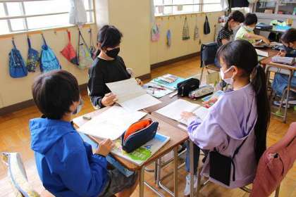 (ノートに貼ってある)これまでのグラフを見ながら、意見を交わしています。