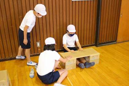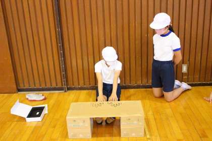 体力テストの「長座体前屈」(下肢の柔軟性をみていきます)を行っています。