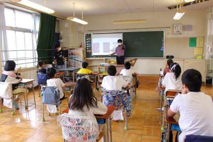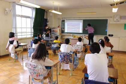 ALTの先生(ジェスチャーを交えて)の自己紹介に聴き入っています。