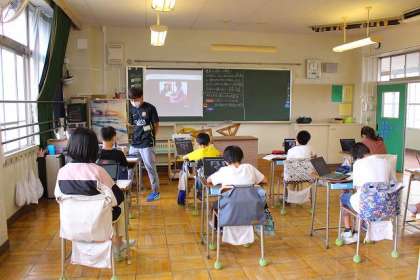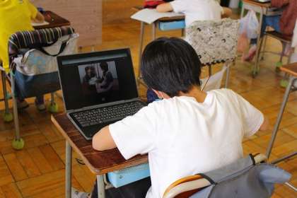 「わたしたちの暮らしを支える政治」子育てについて、どのような取組みが行われているのか? パソコンの映像を見ながら考えています。