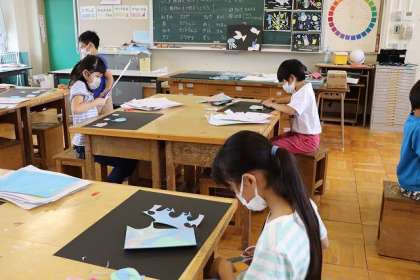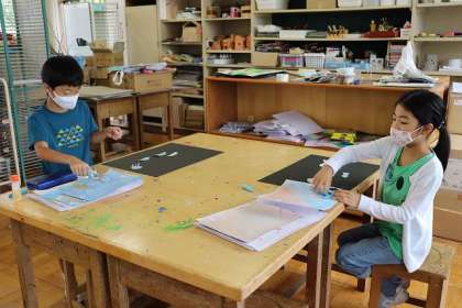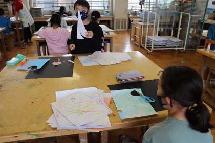 「絵のぐでゆめもよう」模様をつけた画用紙を切ったり貼ったりして、生き物をつくっています。