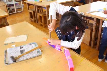 「くねくねへび」金づちとキリを正しく使って木をつなげています。