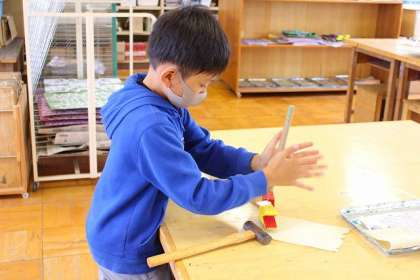 キリを使い、穴をあけ、トントンと音を立てながら・・