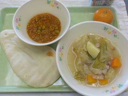 今日の献立:ナン、キーマカレー、野菜のスープ煮、くだもの