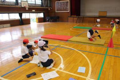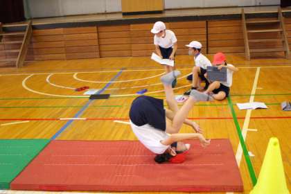 タブレット学習端末を使って「回転技にチャレンジ」を録画しています。