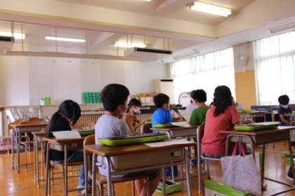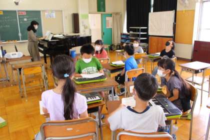 音の高さに気をつけながら、明るい声でうたいましょう。「いいこと、ありそう」を歌う子、キーボードで演奏する子がいます。