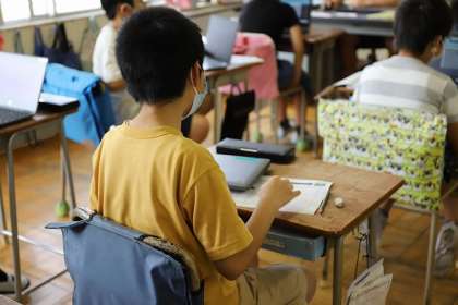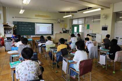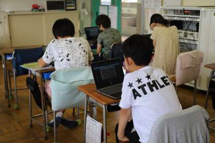 「メダカのたまご」メダカのたまごは、どのように育っていくのだろうか。クロムブックを使って、画面を共有しています。