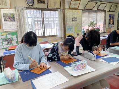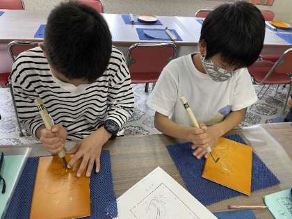 独特の彫刻刀に悪戦苦闘。掘っている木は桂だそうです。