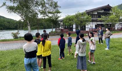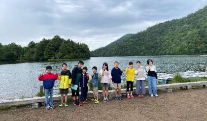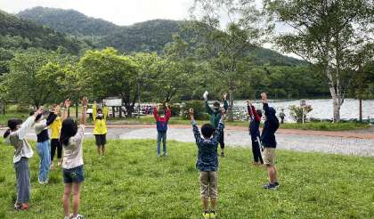 湯の湖湖畔でラジオ体操をして、朝の会。早朝から釣り人が多くいらっしゃいます。