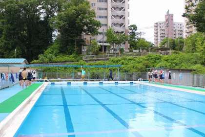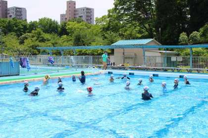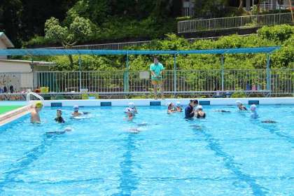 いよいよプールの季節がやってきました。バディ・プールでの約束と一つ一つ丁寧に指導していきます。ようやく顔を沈めながら・・(朝の測定・・気温28度、水温25度)