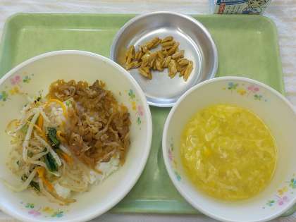 今日の献立:ビビンバ、コーンと卵のスープ、アーモンド黒糖