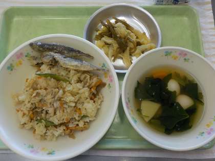 今日の献立:鳥ごぼうご飯、豆アジのから揚げ、すまし汁、キャベツのピリ辛炒め