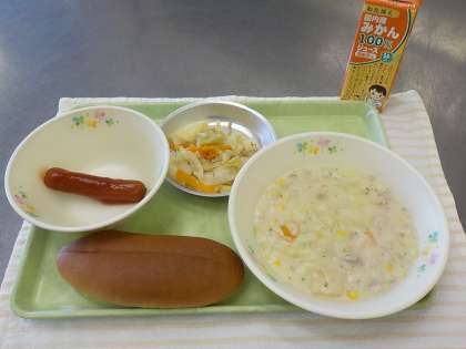 今日の献立:セルフウィンナーサンド、クリームシチュー、雑魚サラダ、オレンジジュース