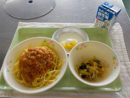 今日の献立:スパゲッティミートソース、小松菜とコーンのサラダ、フルーツヨーグルト