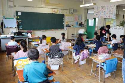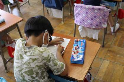 プリントを交換し、丸付けをします。先生の解答の声に「オッケー」と返事を送ります。微笑ましい光景です。
