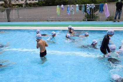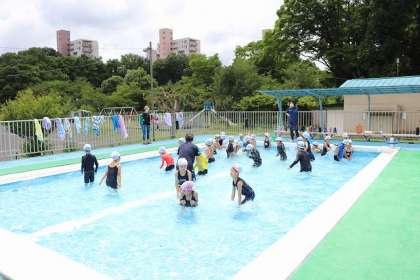 水遊びの時間です。まず、水をかけあいます。次は、動物に変身して動いてみましょう。