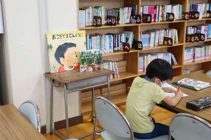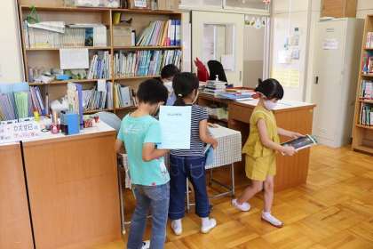 図書の時間です。学校司書の先生が読んでくれた本が見えます。カードに書いたら本の貸し出しです。