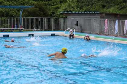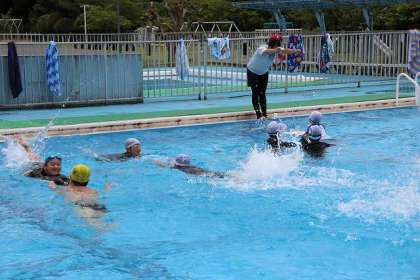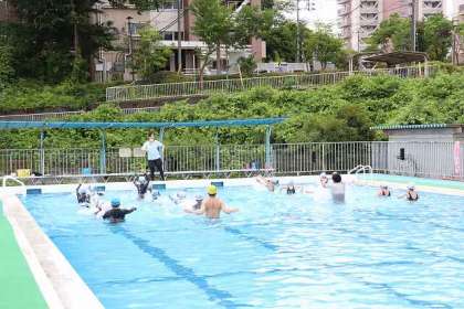水かけ・ペアでバタ足(ビート板を使って)・プールの横までバタ足で進みます。