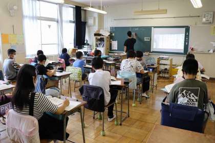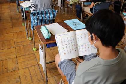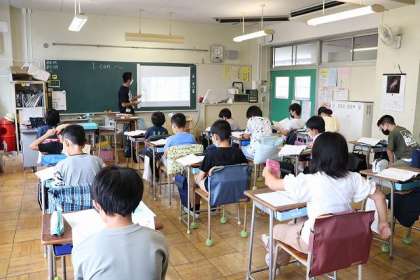 ビンゴゲームをします。先生ができると思うものを選んでください。英単語と絵を結び付けながら考えていきます。