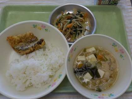今日の献立:ごはん、鯖のカレー揚げ、野菜のおかか和え、湯葉とわかめのすまし汁